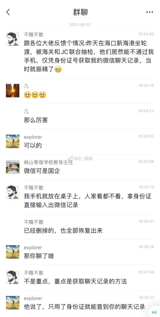 該名網友在6月7日的貼文中提到,他在海南省海口市乘船時被海關和警察抽查。他發現自己的手機並未被直接查看,而是通過身份證號碼,警方能夠獲取他所有的微信聊天記錄,包括已經刪掉的記錄。
